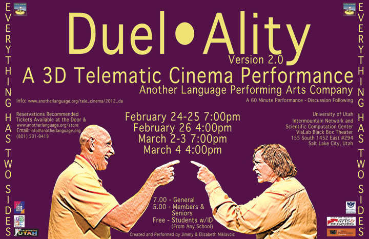 Another Language Performing Arts Company invites you to Duel*Ality, an upcoming telematic cinema project created and performed by Company Directors Elizabeth and Jimmy Miklavcic. This original work will deal with the concepts of relationships and personal duality. Duel*Ality 2.0 examines the many sides of the two characters Duel (Jimmy Miklavcic), and Ality (Elizabeth Miklavcic). This telematic work focuses on two people and the way this duo encounters and functions in this technological world. It looks at the relationship of man and woman, human and computer, software and hardware, as well as, live performance and projected elements. The performance also explores the connection between elements of creativity and how the audience perceives them. The script developed by Elizabeth and Jimmy Miklavcic is a dialogue between Duel and Ality as they wrestle with each other, their expressions, and their technological lives. Throughout the play, they use their computers as extensions of themselves. This telematic performance shows the human side of technology, revealing that everything and everyone has at least two sides. Telematics is defined by Roy Ascott as "computer-mediated communications networking between geographically dispersed individuals and institutions...and between the human mind and artificial systems of intelligence and perception." Duel*Ality 2.0 takes place in a Visualization Laboratory, the VisLab Black Box Theater, where the audience will experience 2D and 3D projections throughout the performance. These projections enhance the story by serving as visualizations of Duel and Ality's thoughts, enhancing the experience of the technological journey. Audience members will wear active stereoscopic glasses during the performance to view the 3D projections. Duel*Ality 2.0 performances will be held February 24-25 at 7:00pm and February 26 at 4:00pm & March 2-3 at 7:00pm and March 4 at 4:00pm. The performance space will be at the University of Utah Intermountain Networking and Scientific Computation Center and will be in the Visualization Lab Black Box (VisLab) on the second floor, room 294. Admission is $7.00 general, $5.00 Another Language members and seniors. Students from any school will receive free admission. The VisLab will only seat 15-20 people, so reservations are highly recommended and can be made through the Another Language Web Store Box Office www.anotherlanguage.org/store, by calling the Another Language Office (801) 531-9419 or by emailing info@anotherlanguage.org. An audience discussion will follow the forty-five minute performance. Another Language Performing Arts Company holds a reputation for creating unique, cutting edge work and Duel*Ality 2.0 will continue in the tradition of the unexpected. Be a part of this one of a kind event by attending the performances at University of Utah. Information on live streaming viewing options is available. |