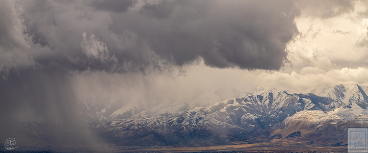 Sunlight broke through the storm highlighting the Salt Lake Valley's western Oquirrh (Oak-er) Mountains. Dynamic weather was occurring all over the valley on November 9, 2022. In some areas the sun was shining, in other places it was snowing, creating compelling compositions. On the right is an area of the mountain range where the Rio Tinto mine is located. Covered in snow it looks like some strange, futuristic city. It was an incredible day to be outside photographing and observing nature’s grace. The name Oquirrh is actually a Goshute Indian word that means Wooded Mountain. The range consists of a string of 10,000 foot peaks that run north to south for nearly 30 miles. Photographer Elizabeth Miklavcic, nine-frame exposure bracketed panorama. Elizabeth Miklavcic - Image Description (11/09/2022) |